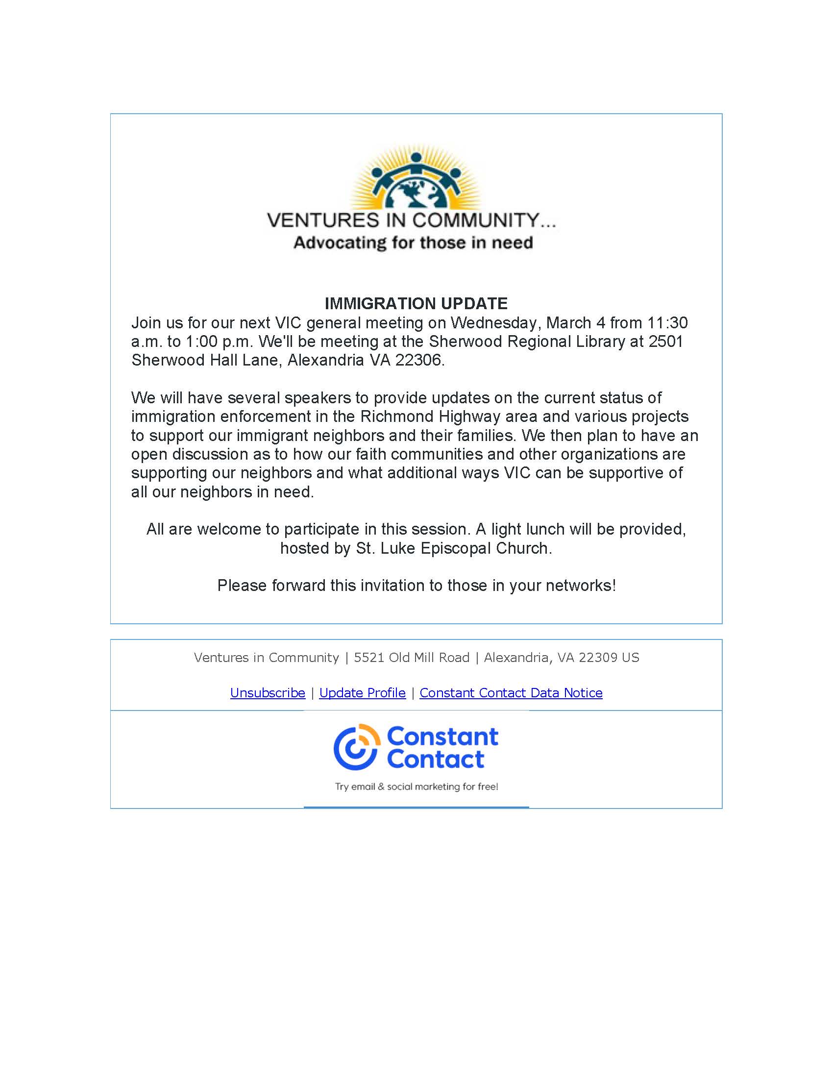 Join VIC for the next general meeting Wednesday March 4 from 11:30 - 1:00 at the Sherwood Regional Library (2501 Sherwood Hall Lane, Alex VA 22306).